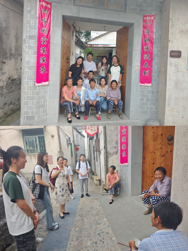 随后同学们走进千年文化古村仁里村,感受传统徽派建筑在创新灯光艺术点缀下焕发的时代魅力,历史文脉与现代气息在光影间交错相融,相得益彰。同学们深入街巷,参观了“两弹一星”元勋程开甲故居、古代宗祠,了解了古徽州文化。与当地留守老人亲切交谈,了解当地村民家庭收入来源和结构,以及乡村在政策扶持下的变迁与发展。同时,同学们向老人们教授基本的普通话常识,纠正她们说话的口音习惯,在生活实际沟通技巧方面尽绵薄之力。