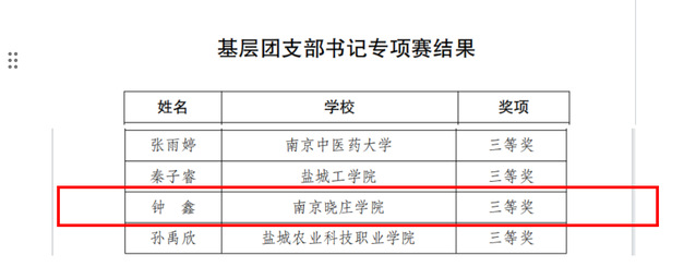 近日,江苏高校百校万名团干部思政技能大比武结果正式揭晓,经过校赛、省赛层层选拔,ylzzcom永利总站线路检测24财务管理1班团支部书记钟鑫在基层团支部书记专项赛中脱颖而出,荣获三等奖,充分展现了ylzzcom永利总站线路检测青年团干部的过硬能力与担当风采。