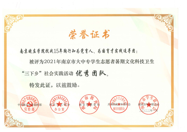 近日,共青团南京市委对2021年南京市大中专学生志愿者暑期文化科技卫生“三下乡”社会实践活动表现突出的团队和个人予以通报表扬,我院“陶行知为党育人、为国育才实践追寻团”荣获“南京市大学生暑期社会实践优秀团队”称号。