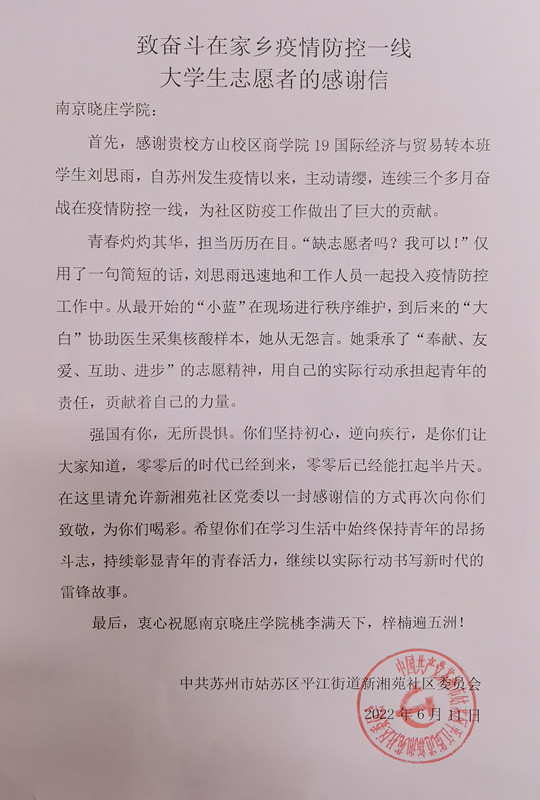 “感谢贵校方山校区ylzzcom永利总站线路检测19国际经济与贸易转本班学生刘思雨,自苏州发生疫情以来,主动请缨,连续三个多月奋战在疫情防控一线,为社区防疫工作做出了巨大的贡献。”近日,南京晓庄学院ylzzcom永利总站线路检测收到一封来自中共苏州市姑苏区平江街道新湘苑社区委员会的感谢信。信中对ylzzcom永利总站线路检测2019级学生刘思雨同学在2022年苏州疫情期间热心为社区提供志愿服务的行为致以衷心的感谢,并对学校培养出综合素质过硬、德智双全的学生致以崇高的敬意。