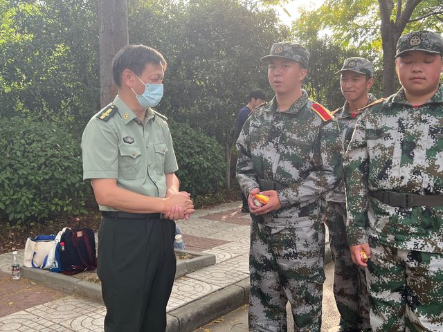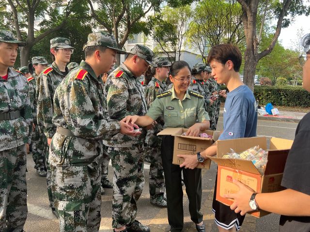 老师们来到三营的军训地点,同学们目光坚毅、精神饱满,在烈日下坚持训练,强健着自己的体魄,磨炼着自己的意志。史兹国书记观看了同学们这两天的操练成果,并对见习参训的同学表达了关怀、提出了要求。随后,学院领导和老师们给大家发放了中秋月饼、美味零食等慰问品。