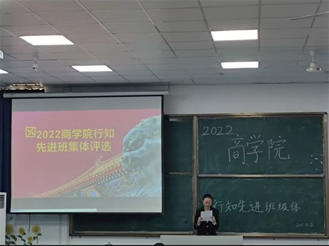本次评选坚持“公平公正,公开透明”原则,主持人宣布评选规则,十个参与评选的班级有秩序地进行了班级精神风貌的展示。包括班级精神、班风建设、学习、评奖评优情况,班级管理、团队合作,以及学陶师陶活动等,各班推介本班的同学个个声音洪亮、慷慨陈词、用新媒体手段展示着各班的优势,只见视频上文字画面精彩纷呈,展现了我院学生积极向上的精神风貌。评选老师现场打分,最后19级财务管理1班、20级行政管理2班、21级国际经济与贸易1班、20级财务管理3班、21级国际经济与贸易2班、21级经济与金融2班、 21级物流管理2班、20级物流管理班级八个班级获得了“行知先进班集体”的荣誉称号。20级行政管理2班、21级国际经济与贸易1班两个班级被推荐参加学校“十佳班级”的评选。