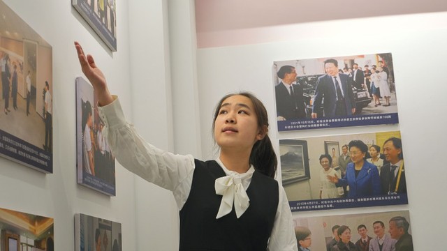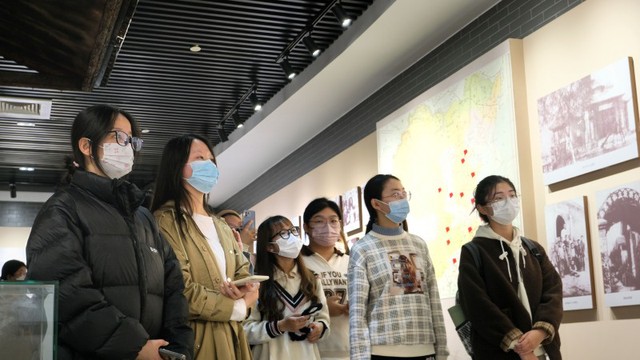 讲解员带领同学们参观校史馆
