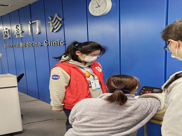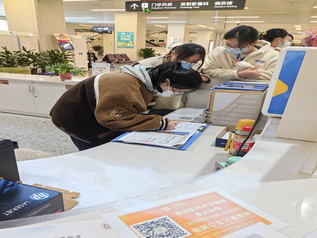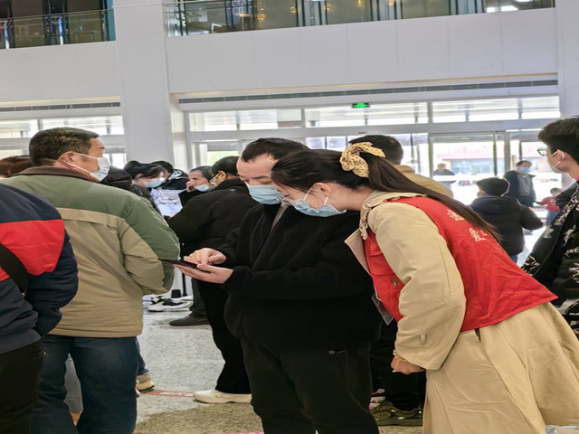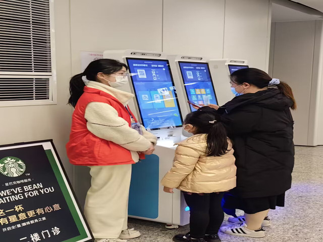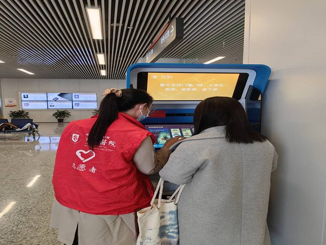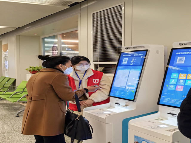志愿者在自助机旁帮助患者
