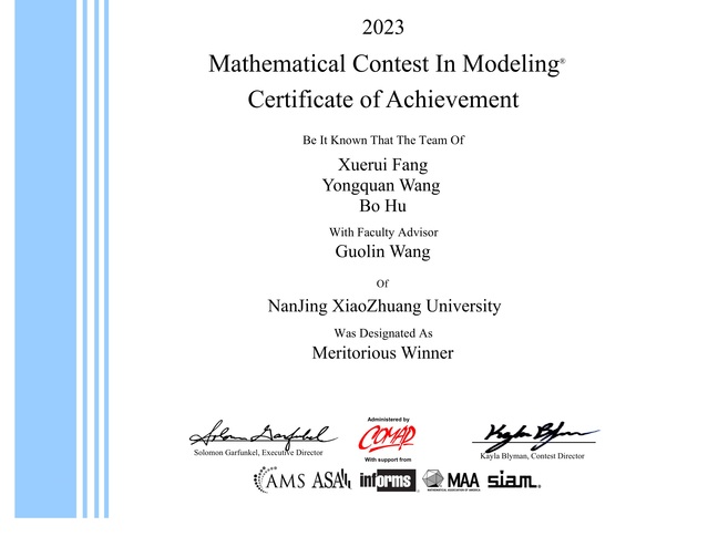 近日,2023年美国大学生数学建模竞赛成绩揭晓,我院王国林副教授指导,方学睿(20级经济与金融专业)、王永泉(21级食品质量与安全专业)、胡博(20级财务管理专业)等三名学生组成的团队获得国际一等奖(Meritorious Winner)。