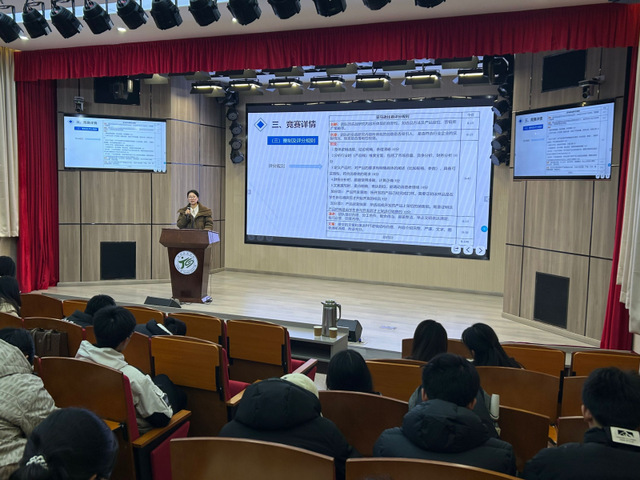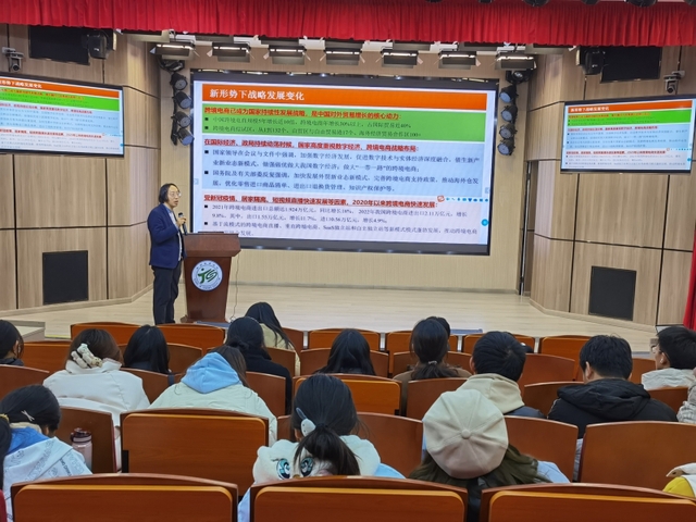 吴老师从跨境电商的发展变化、产业环境分析、高校跨境电商人才培养战略以及跨境电商实战竞赛四个方面作了详细介绍,他还通过列举事例,具体阐述了电商发展的时代意义和未来前景。讲座现场气氛热烈,同学们积极提问,吴老师就同学们关心的电商实战赛基本操作及比赛规则进行了解答。