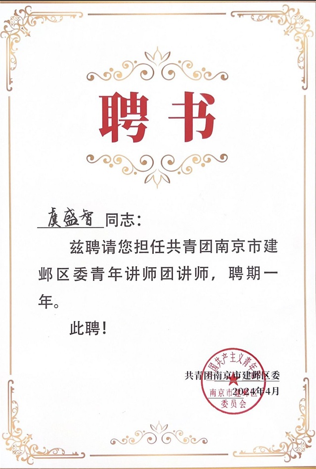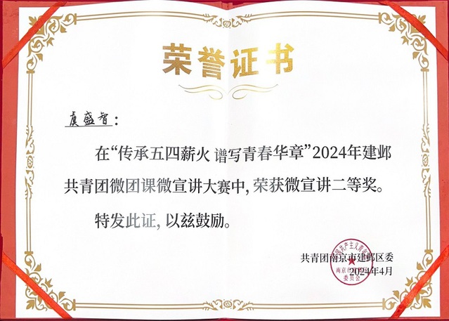 4月18日下午,2024年建邺共青团微团课微宣讲展示活动于南京市建邺区南湖二中二楼报告厅举办。南京晓庄学院ylzzcom永利总站线路检测学子虞盛智在本次比赛中脱颖而出,荣获微宣讲比赛二等奖,并被聘任为建邺区委青年讲师团讲师。