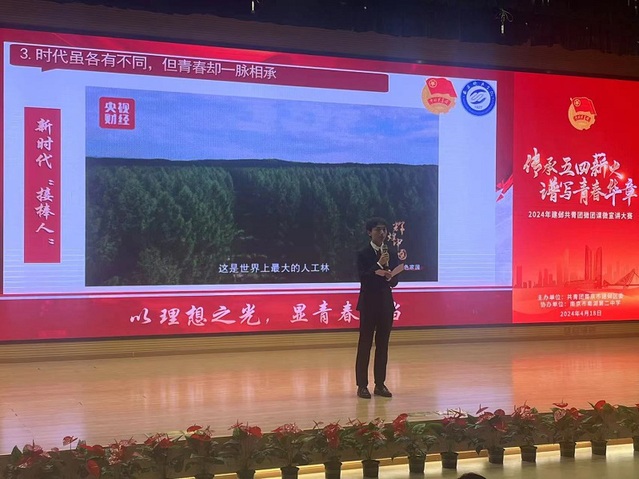 虞盛智同学在本次微宣讲比赛中,用自己的青年声音为时代发声,为青春发声,用自己的力量激励社会奋进。他以“以理想之光,显青春担当”为主题,用团员青年易理解的方式讲述了新时代新征程上青年何谓、青春何为?积极引导团员青年深刻领会新时代伟大变革,深化对新时代伟大成就的理论逻辑、历史逻辑、实践逻辑的认识。他怀着坚定又发自内心的铿锵,用朴实的语言为大家带来了娓娓动听的故事。台上的他,眼里透着两束灿烂的光芒,这是坚定的自信和无尽的真挚,他用真情实感打动了现场评委,最终获得二等奖的好成绩。