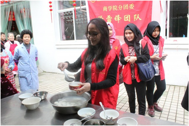 “你们是哪儿的孩子啊?”“爷爷奶奶大家好,我们来自印度尼西亚。”中文水平很棒的大男孩林家安谦恭的应答着老人。尽管是第一次到来,印尼“雷锋”们却像见到故人一样与老人亲近。他们操着还算熟练的中国话和中国的志愿者们一起与爷爷奶奶聊家常。听说是远道而来的留学生,老人又关心起他们的适应情况。他们还为老人整理房间、分蛋糕、下元宵、盛汤圆,老人们品尝着孩子们亲手递上的热腾腾的元宵,分外欢喜。