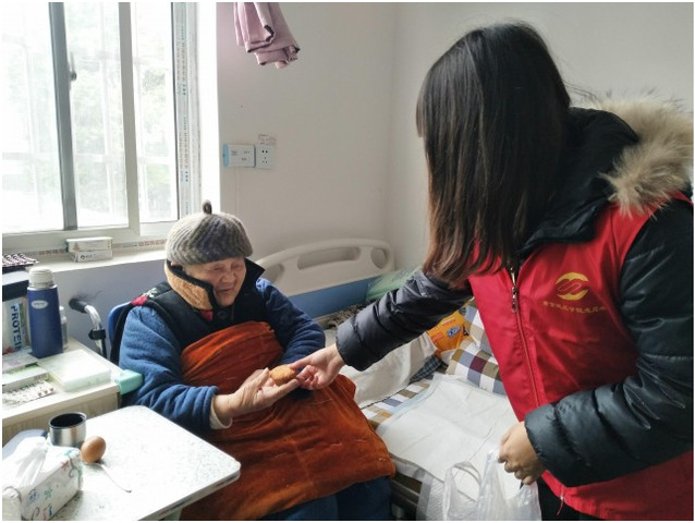 志愿者践行雷锋精神为老人带去点心、帮助叠被子